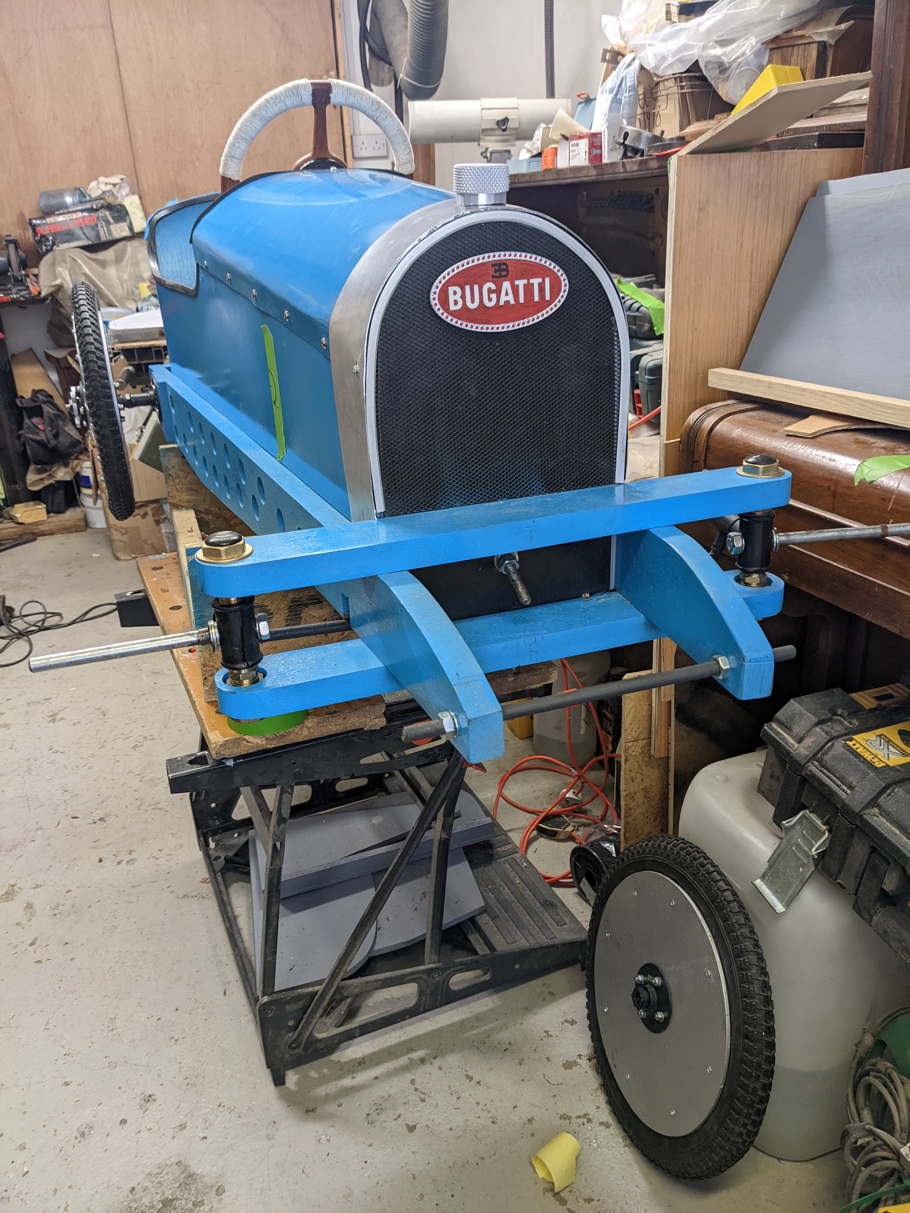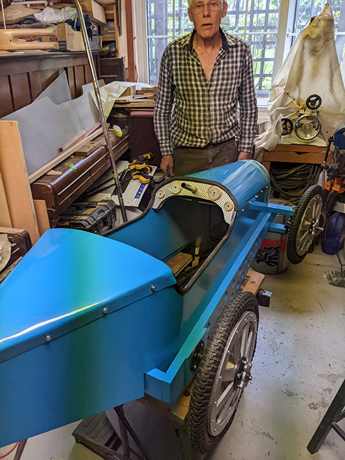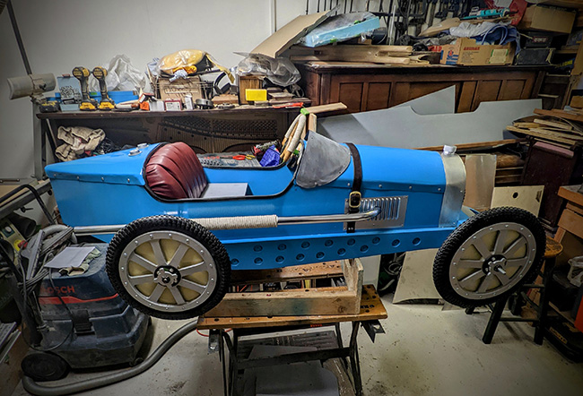 Pedal Racers! It's really interesting to see how they built theirs, with a lot of nice attention to details. It looks like they welded up their crank-axles, rather than bending them as in the plans. Minor improvements here and there all over the place! Nicely done! I imagine living a few miles from the UK Bugatti Club is truly inspiring!