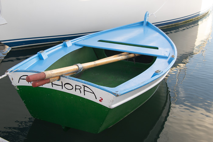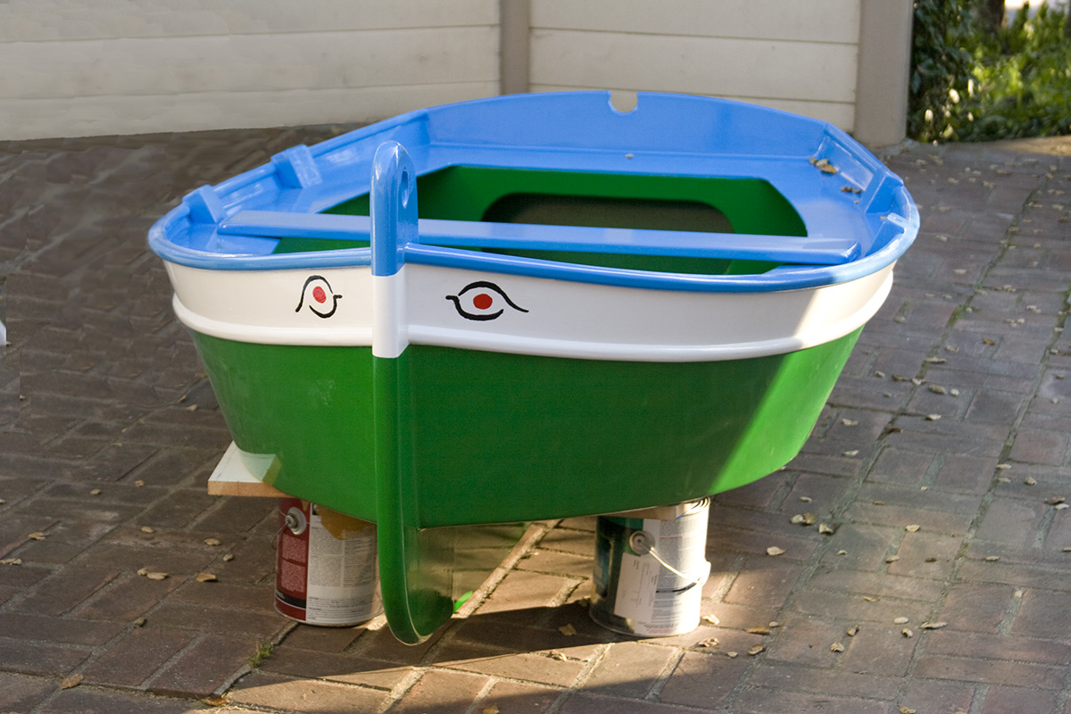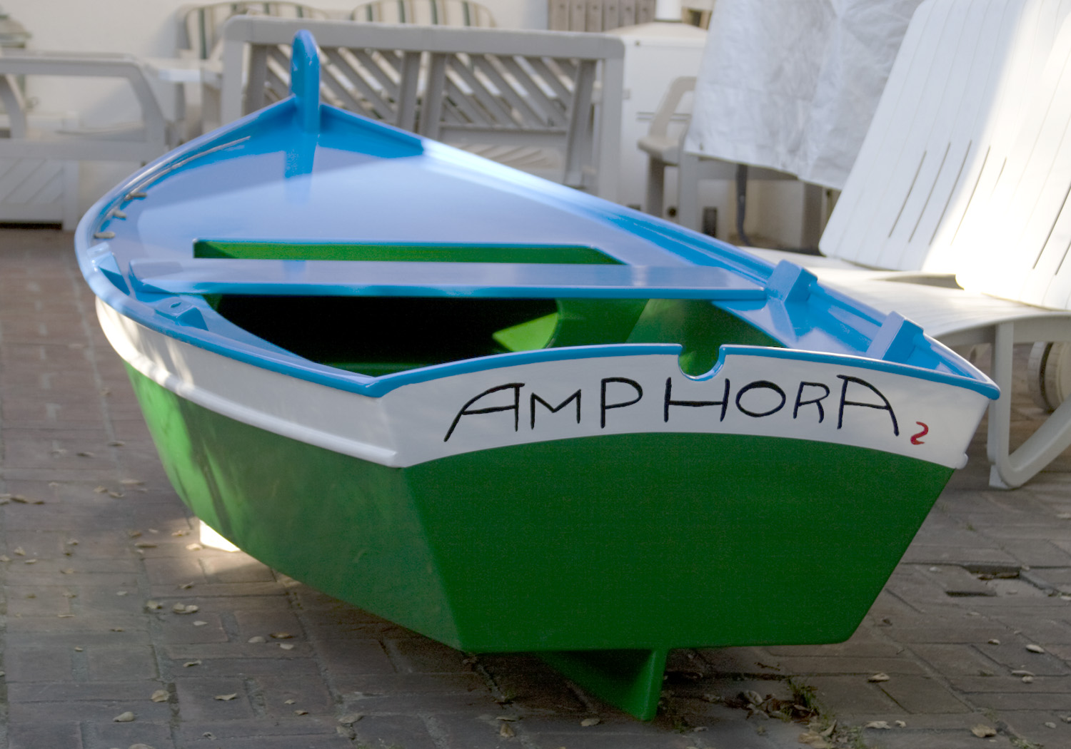 The beamy shape of the Amphora makes it a great little dinghy, and being based on working boats of the Adriatic, it doesn't mind a bit of knocking about. The photo to the right is the same boat as the one just above, but now ten years later! We're going to do some touch up painting soon, and since this Amphora is sitting in saltwater now, we're going to add a bit of bottom-paint tokeep the sea growth off, but I thought this shot shows how nicely these boats can stand up over the years, with only a bit of care. This boat was fiberglassed with epoxy resin, but has been sitting outside, uncovered, for half of its life!