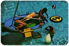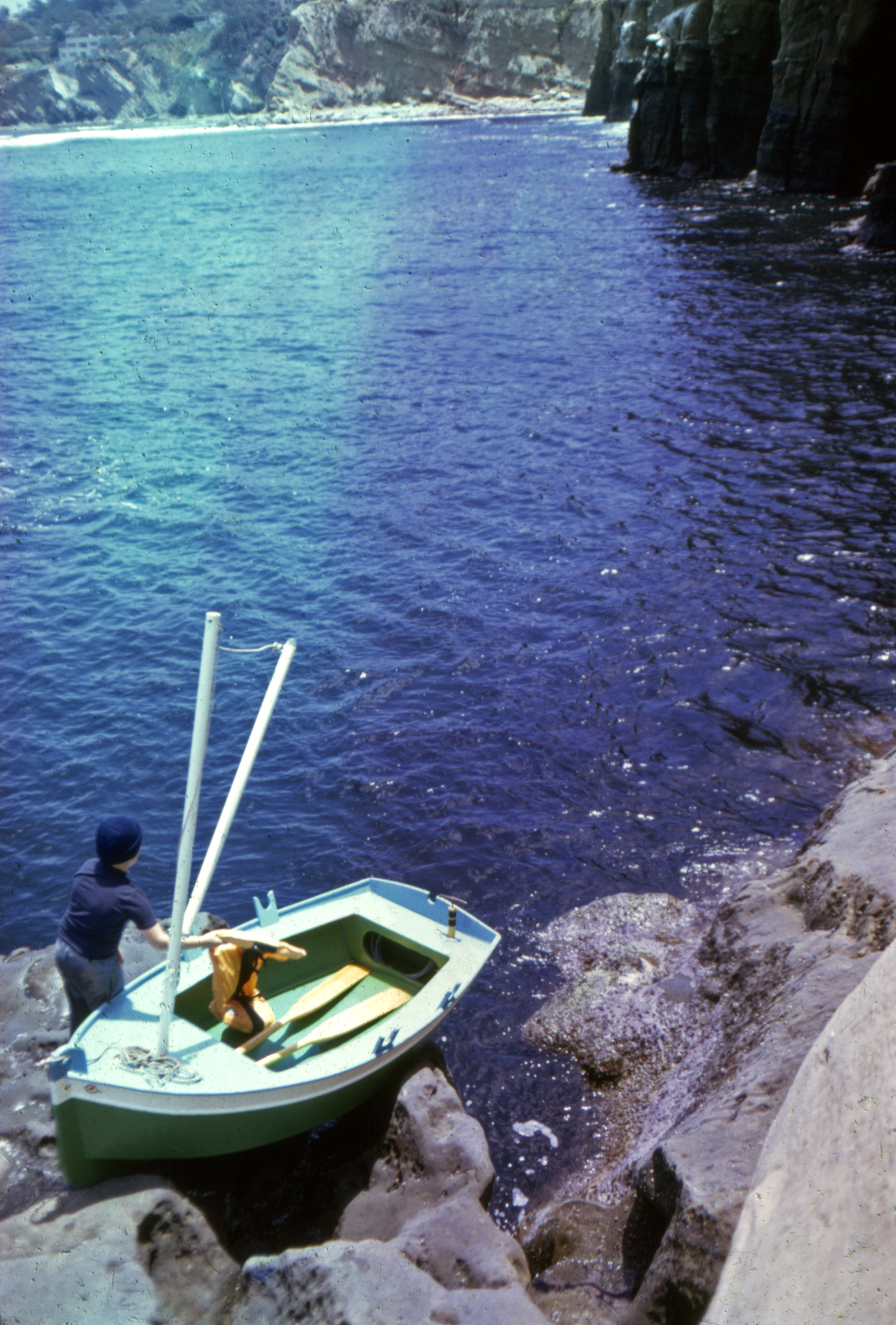 Peter lugged the Amphora down the rocks to La Jolla Cove and we launched it there, carefully! (there's usually a pretty good surge, if not biggish surf) While we were getting photos with me keeping an eye on the Amphora, two guys came out of the water in scuba gear! The central theme of The Amphora book is underwater exploration, and the timing couldn't have been better! This slide was just a bit before those guys came up, and wasn't used in the book. Still: I was really happy to find this in our archive boxes of slides!