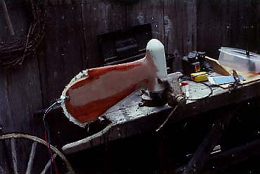 Fiberglass covering the new parts. This will be bondoed (or smoothed in whatever form you use), then painted and drilled for a pivot point as needed by the mount you make. The wires will be lengthened and quick disconnects will be used to allow for removal of the motor when trailing, etc. Mount the motor head (the controller part) where it's most convenient for you. We have ours under a seat, poking out into the foot weel area, but we've modified the twist grip so that it has a lever we can kick with our feet to set the boat in motion. This may be far too awkward for some people, but it serves as an idea of how just about any arrangement can work.