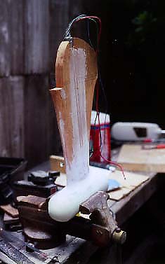 The photo above shows the bracket we made to hold the motor. It's just plywood and a bit of 2X2. We can release the line and drop the motor very quickly; it only takes a few seconds to drop the motor and turn on the motor. The only big drawback in this set-up is that there's no provision for reverse, as the motor will just back up out of the water. We haven't found this to be a problem in practice. The trolling motor is modified thusly: Take off the control head, mount that somewhere handy and extend the wires as needed (Take note of the larger wire recommendation above, and also the quick-disconnect plug in the photo above for storage). The trolling motor and its pipe are faired in with a handy core material; we've used both urethane foam and redwood in our motor conversions. Bondo-type material for sticking things together and fairing before and after glassing. If you're an epoxy-prone builder, then you'll be using that. Glass the motor assembly but keep in mind this is an aesthetic and hydrodynamic job; the motor's plenty strong enough on its own. We have tried to avoid, as much as is convenient, bondo-ing and glassing the motor housing itself as they usually rely a fair amount on the water they're immersed in for cooling.