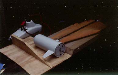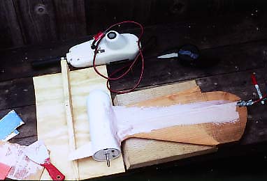 Here the motor is propped up and the farings are held with bits of wood so that they're parallel and at the right height. Bondo will be used to hold the fairings and smooth the assembly until glass is added. Epoxy people will no doubt be using something other than bondo.