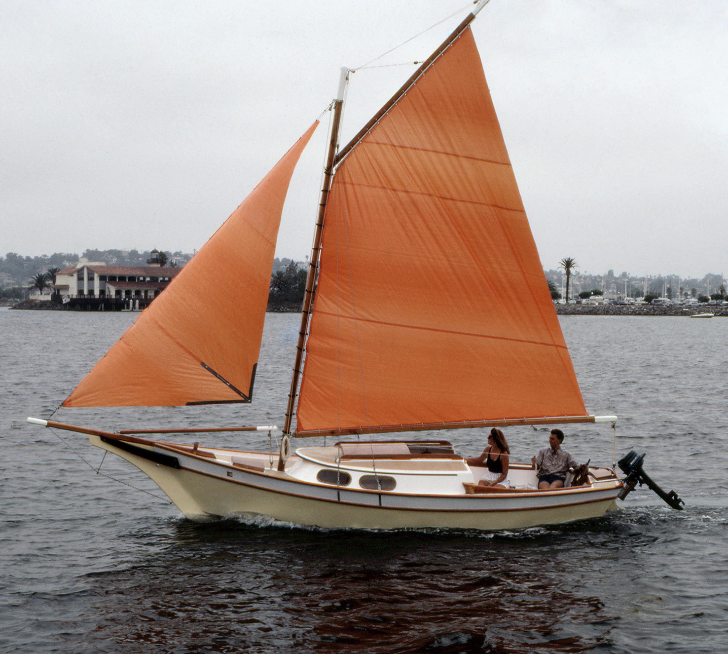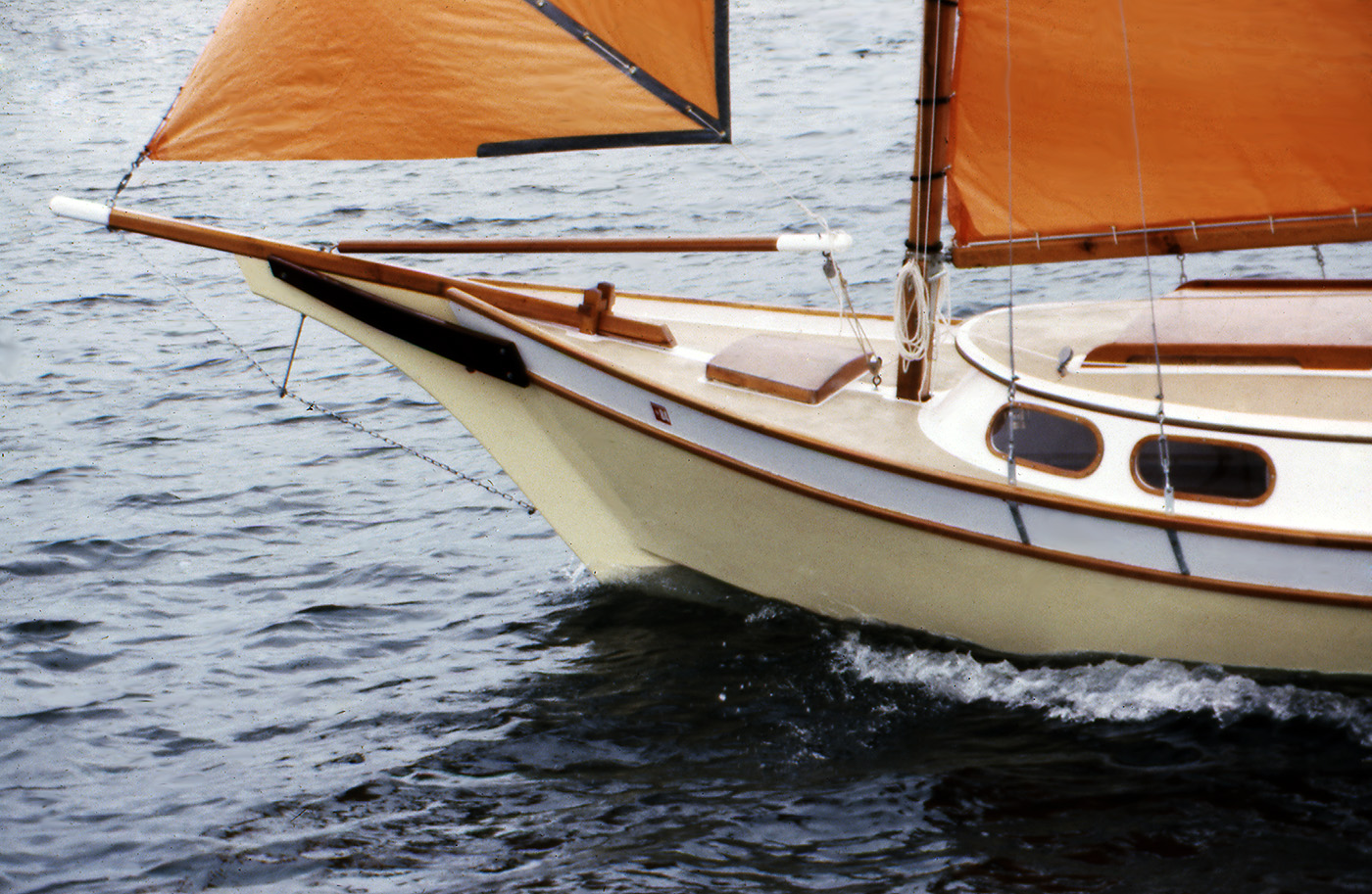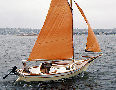 The Vacationer grew out of the Weekender; people had been asking for a larger model, so we forged ahead. The Vacationer turned out 21' on deck (24' overall), with the same type of shoal draft, full-length keel and clipper bow that worked so well on the Weekender. She has built in camping fixtures and a more rakish cabin than the Weekender. The Vacationer is a pretty good-sized boat, with a nice smooth sailing feel to match.