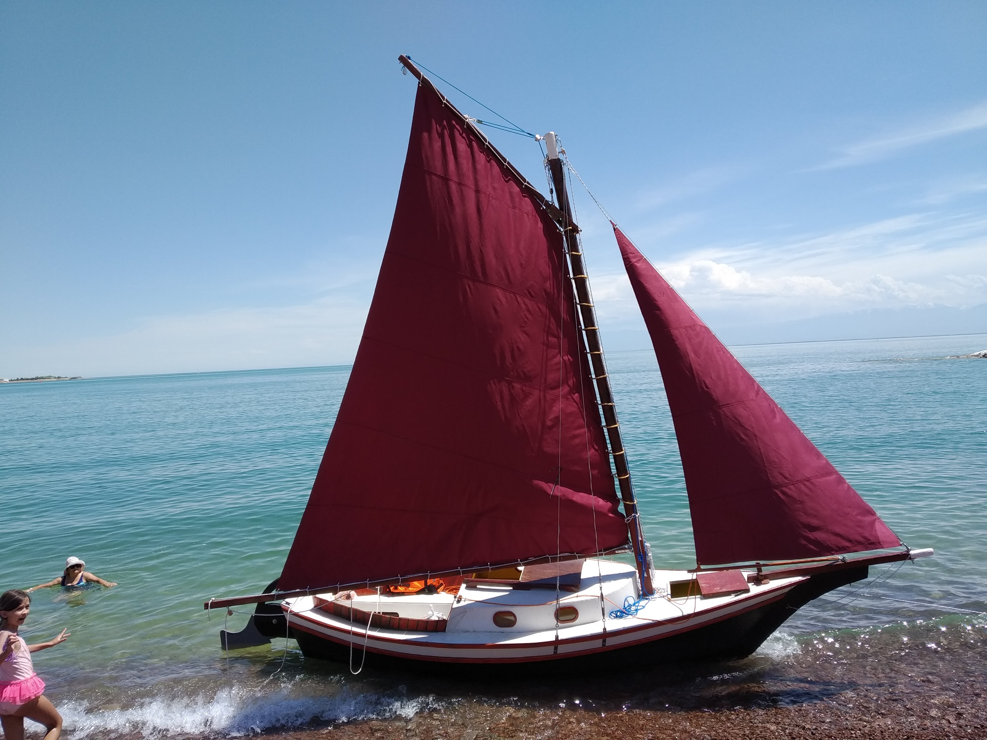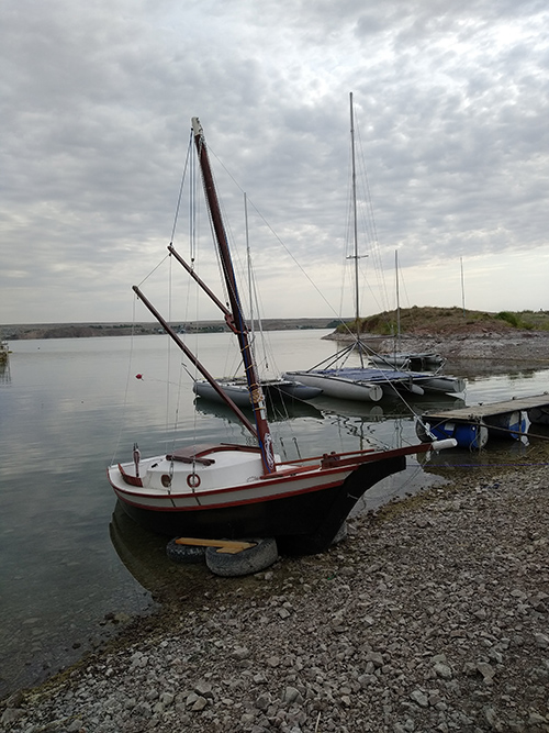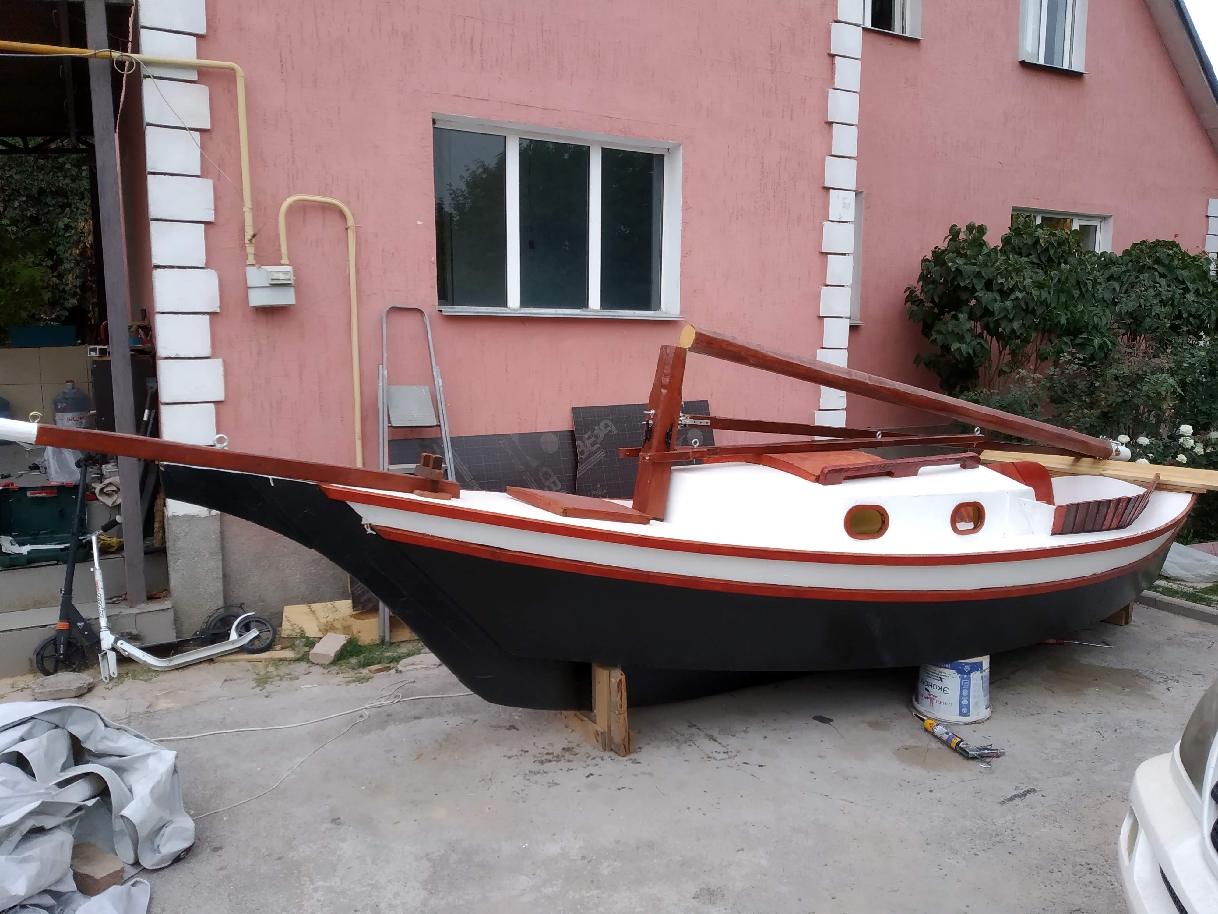This is a fairly stock Weekender, but there are a few really interesting modification Mr. Ostashko has made: A very nice tiller and rudder box, with a new and unique style! He also has made the cockpit seats come up above the deck to serve as a coaming as well as seat-backs. I think he also madw hia own sails. Very nice!