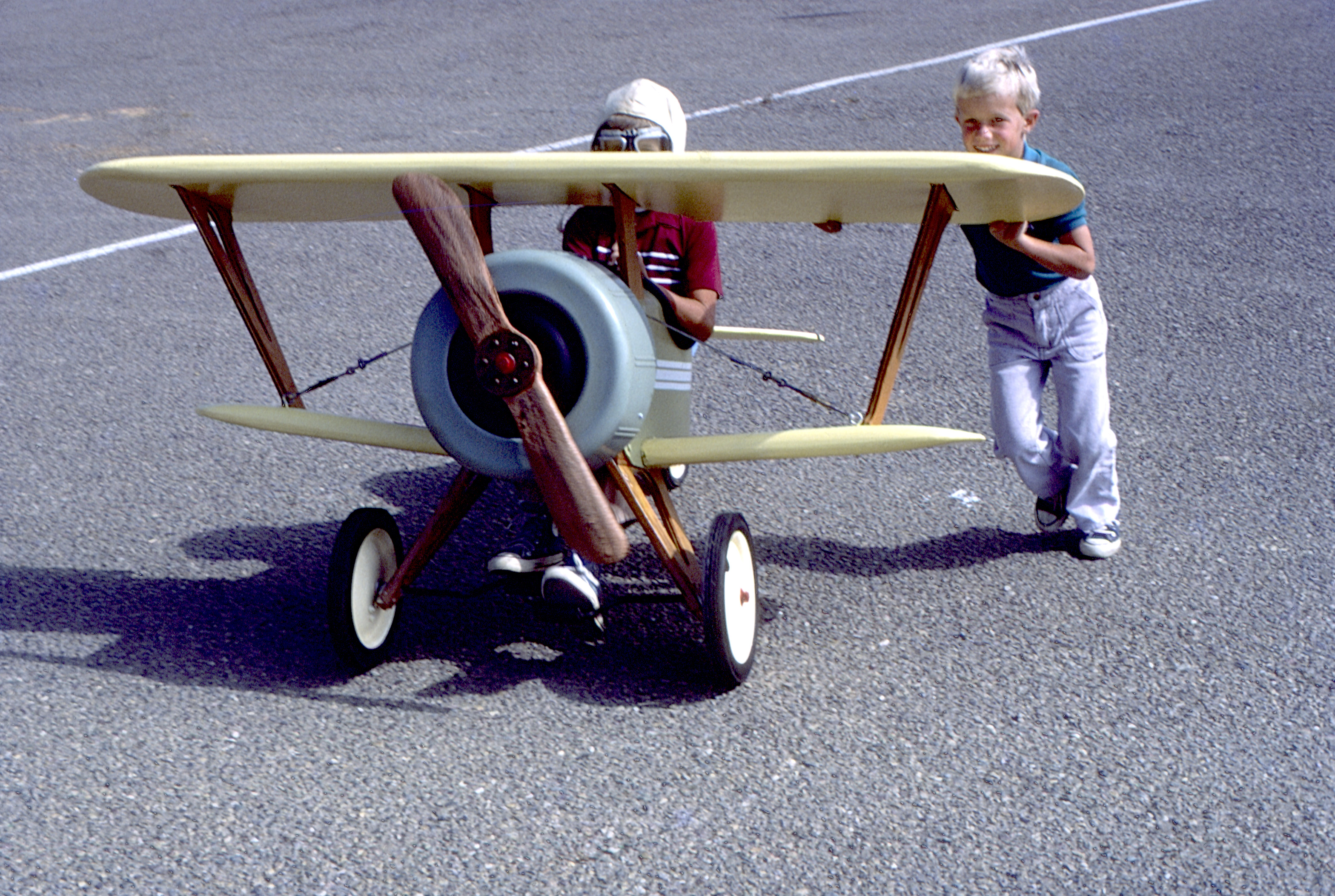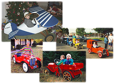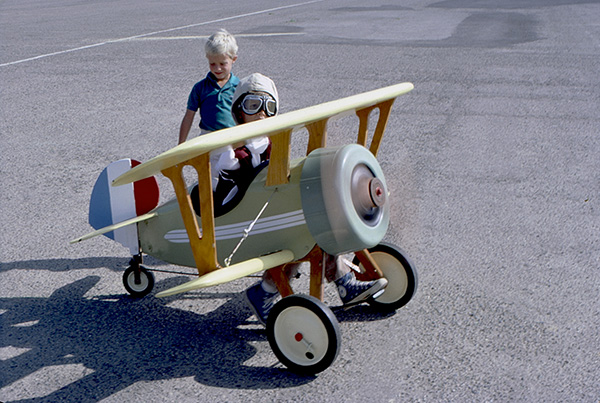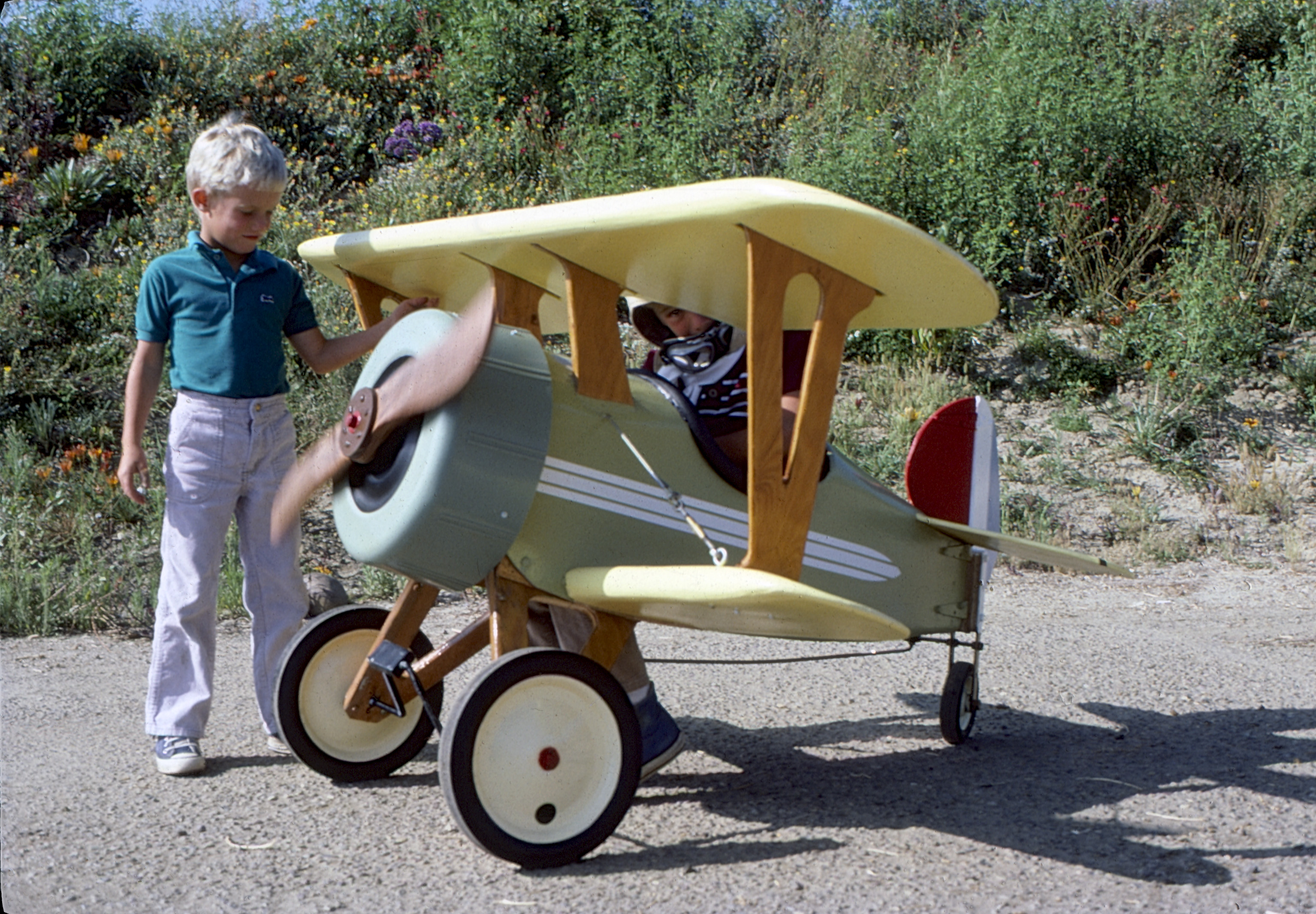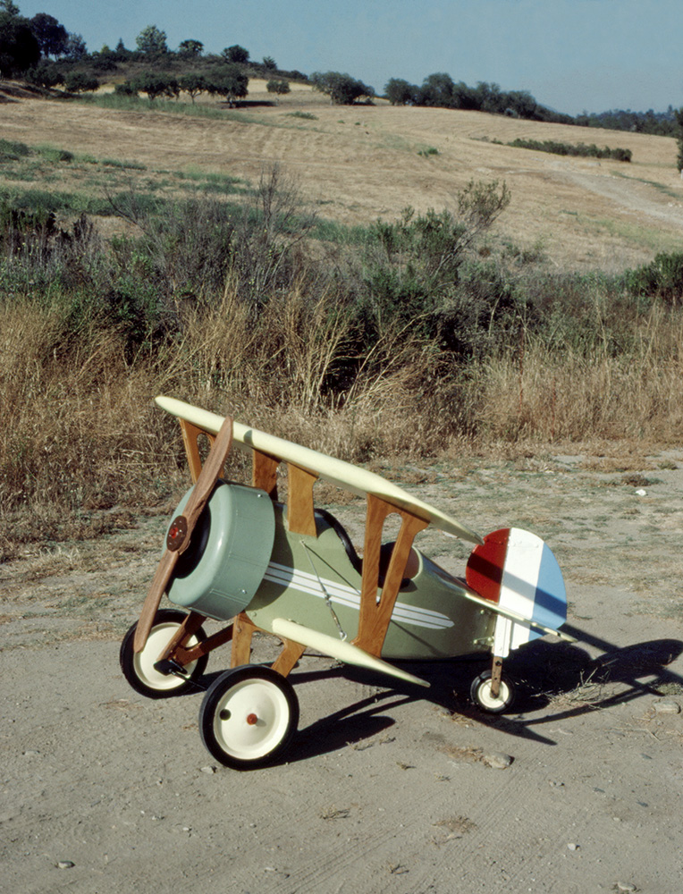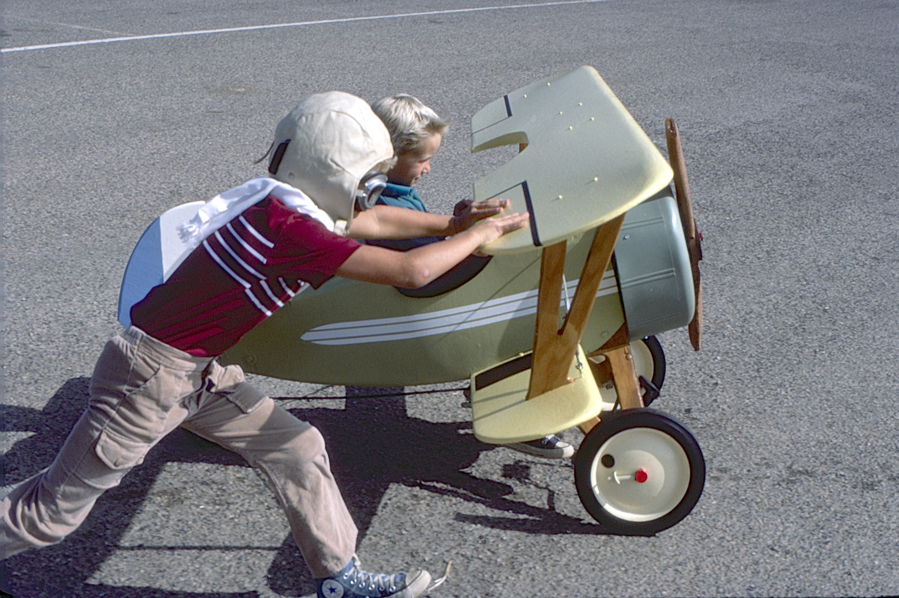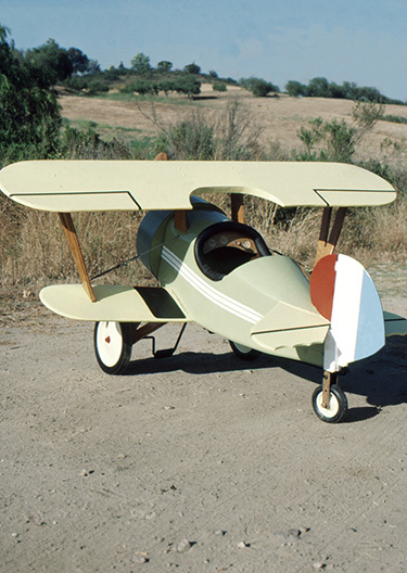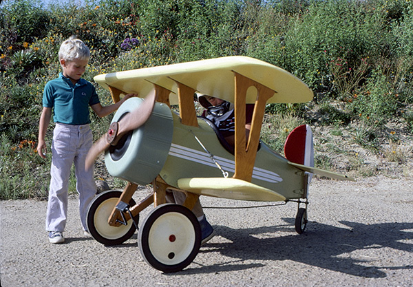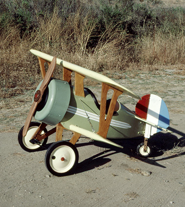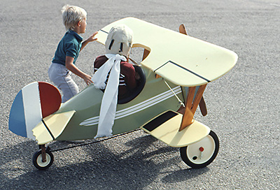 The Pedal Biplane is a bit different pedal project: A cute, fun 1930's barnstormer you can build for a budding aviator! The Pedal Biplane's attractive style is based on a number of iconic biplane elements, ranging from WWI planes to the classic planes of the '30's. We used to keep ours sitting in the patio for decoration even when there weren't any kids around! This project is a big hit with kids and it's easy to see why: Great looks to set the imagination flying, steering with the control stick, and a propeller the pilot can spin from inside!