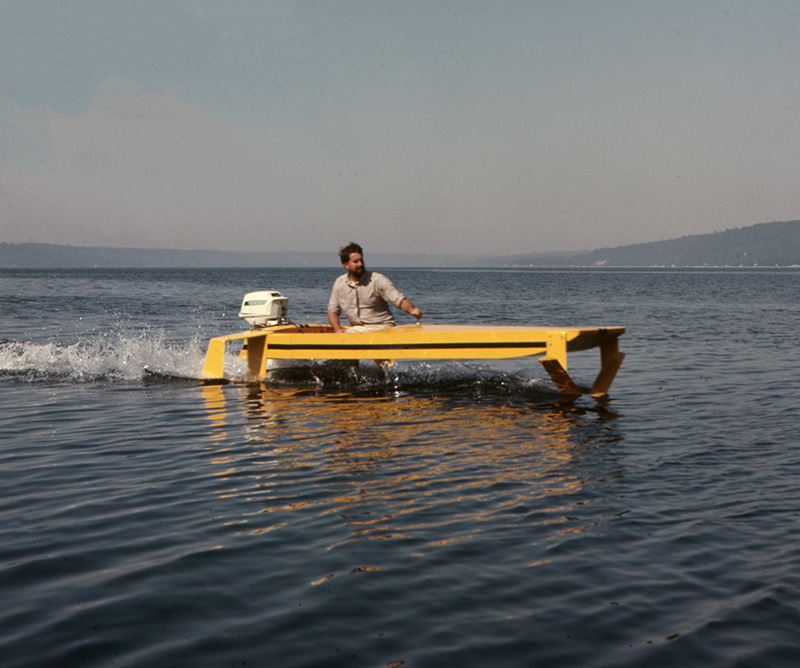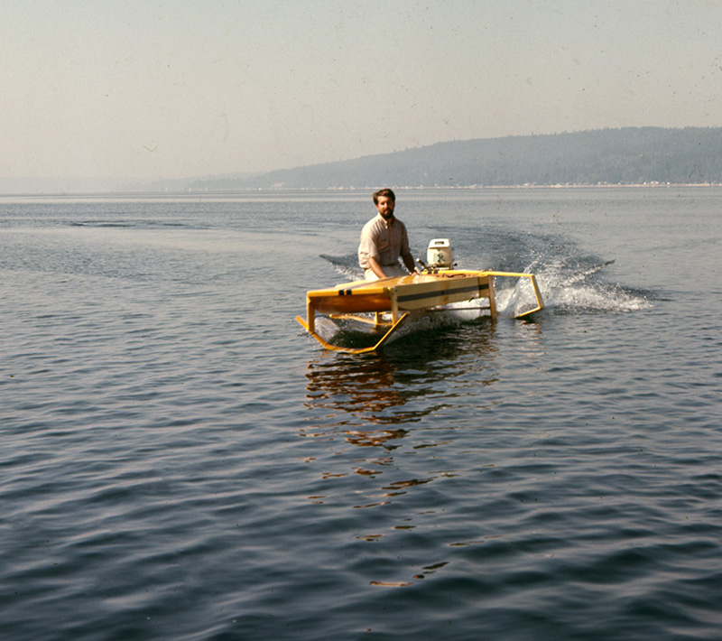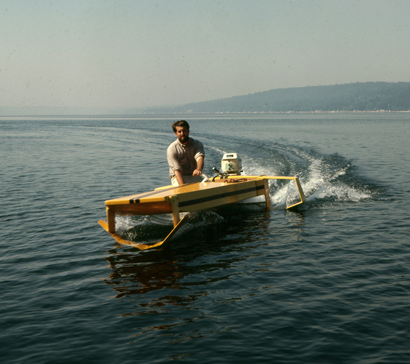 We started out with an experimental sailing hydrofoil, remarkably. Making a sailing hydrofoil is pretty tricky, and this very simple construction was only able to get on foil in certain conditions and couldn't tack, so we switched to a powered version: The Sportfoil was the result! Because this is such a lightly-loaded hydrofoil, we can use very small outboards (5-15hp.) and still have great performance. The America's Cup (which is on as we write this!) is showing the world just what sailing hydrofoils are capable of, in the most amazing and exciting ways! The Sportfoil is an older design, but is a good starting point to discover what it's like to fly a boat!