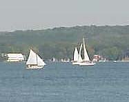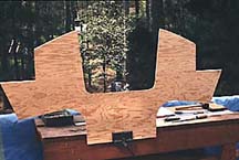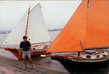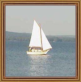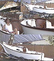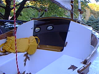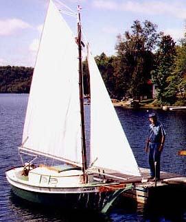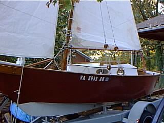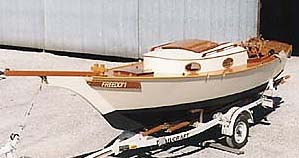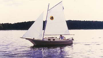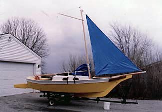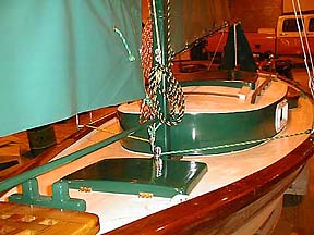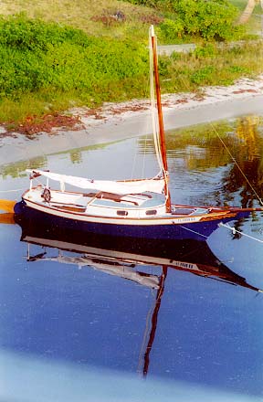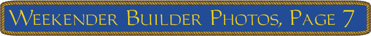 Mr. Jones has sent us this picture of his very elegant looking Weekender. Finished in shades of blue, with extra brightwork, it's a strikingly pretty boat. Since these shots were taken, Mr. Jones has switched to a tiller and is experimenting with a little lead ballast for added stability. As many of you probably know, we're strongly anti-ballast personally, but equally pro-experimentation when it comes to projects, so we look forward to hearing how this works out. Bob has also made mast hoops from pine, and a nice three-position boom crutch, both of which are visible above.